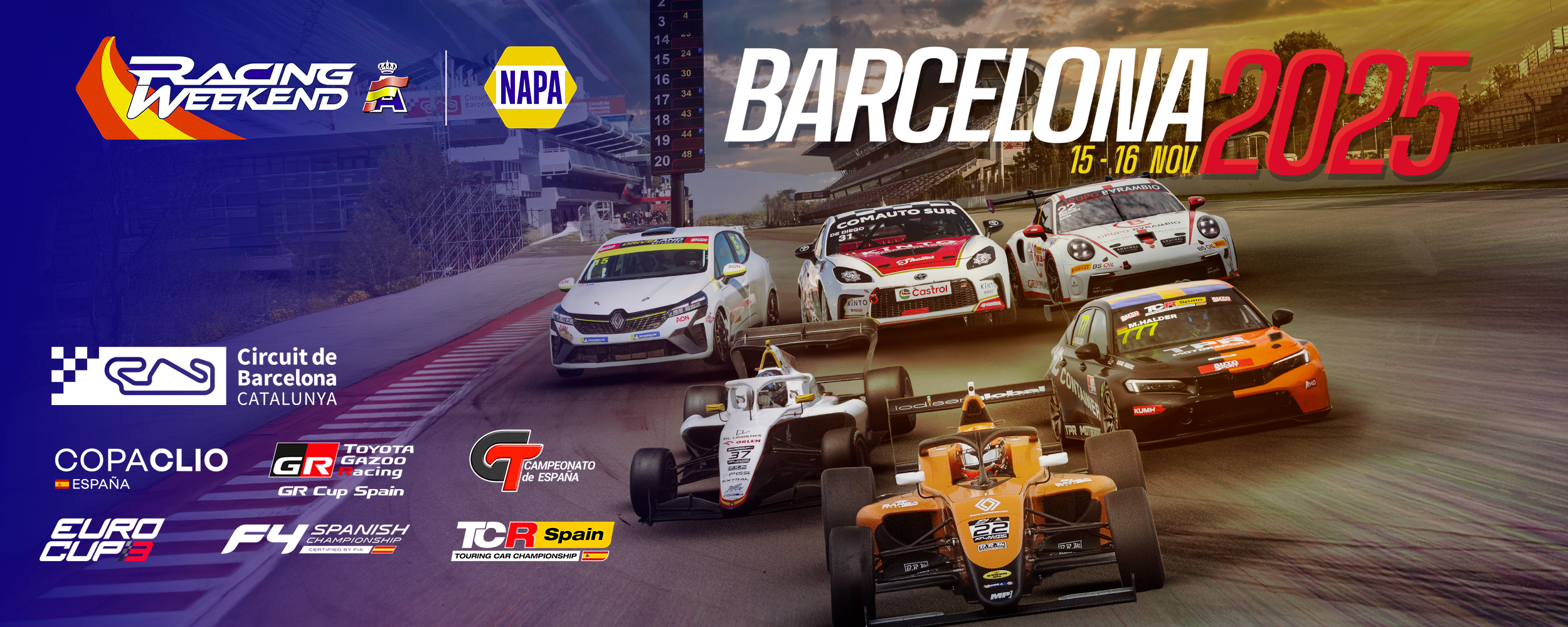 El NAPA Racing Weekend regresa al Circuit de Barcelona-Catalunya este fin de semana para vivir dos jornadas repletas de adrenalina. Durante este sábado 15 y domingo 16 de noviembre, el TCR Spain, el Campeonato de España de Fórmula 4, el Campeonato de España de GT y Turismos, la Toyota GR Cup Spain y la Copa Clio España se dan cita para acercar sus competiciones al público barcelonés.